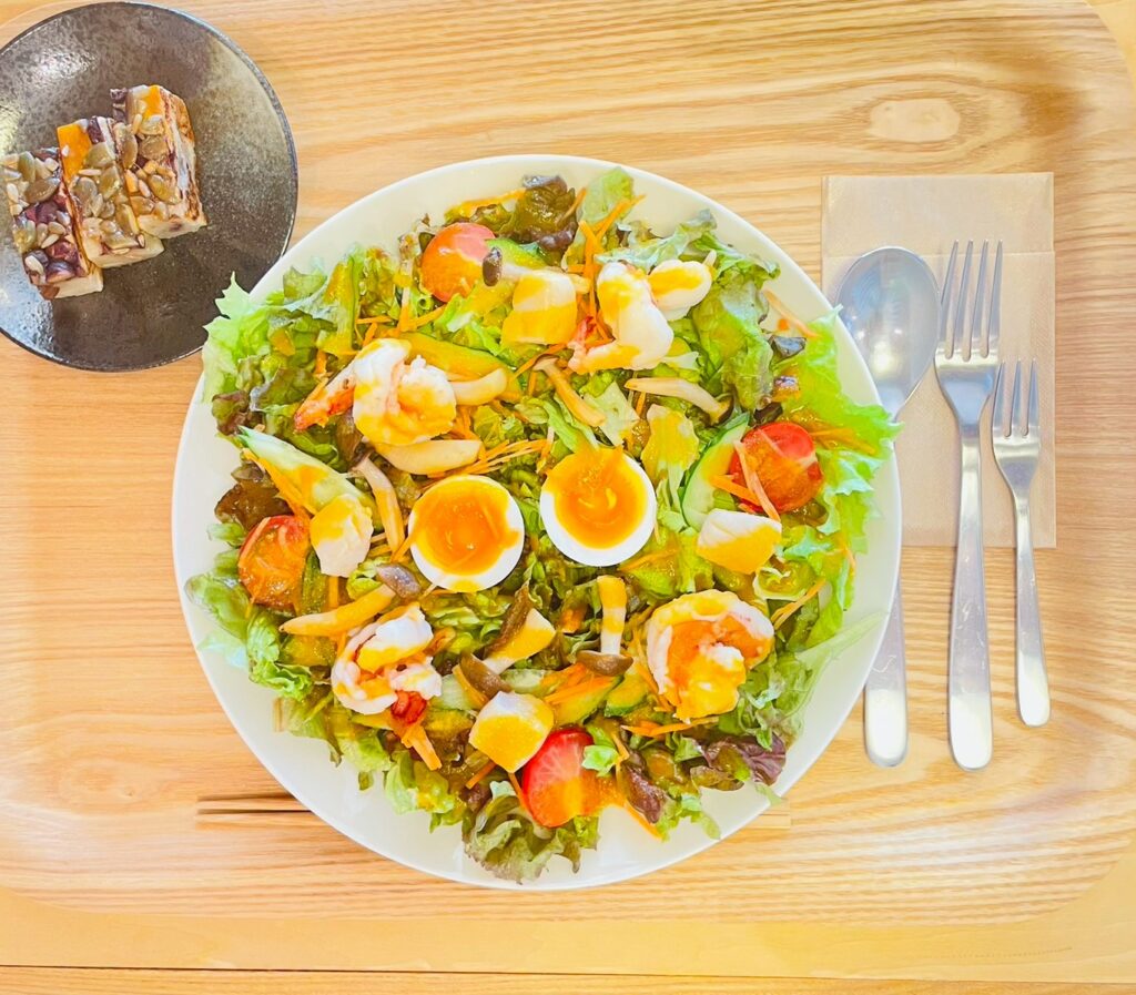 メニューはパスタやボリュームたっぷりのサラダランチ。またチャルトックという韓国の伝統的な餅菓子があり、さつまいもやかぼちゃの種などが練りこまれ、ちょっと小腹が空いたときにおすすめのスイーツです。